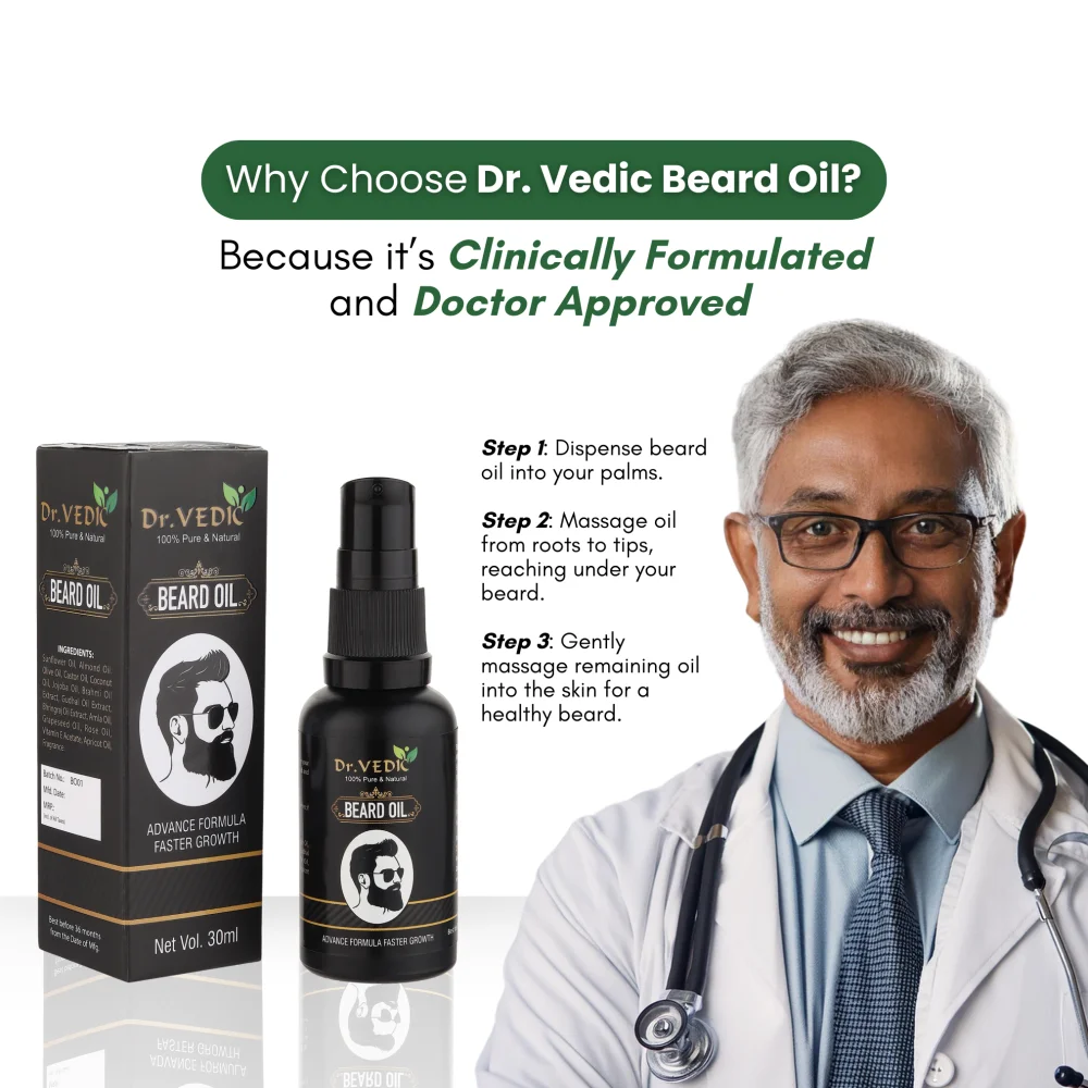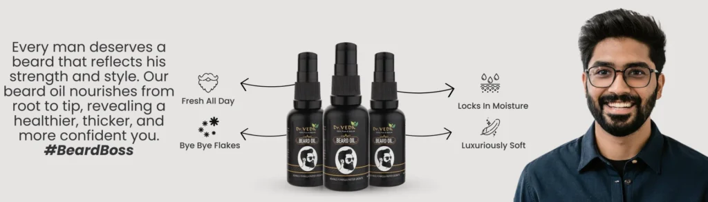 A. Dr. Vedic Beard Oil helps keep your beard fresh all day, eliminates flakes, locks in moisture, and makes your beard luxuriously soft.